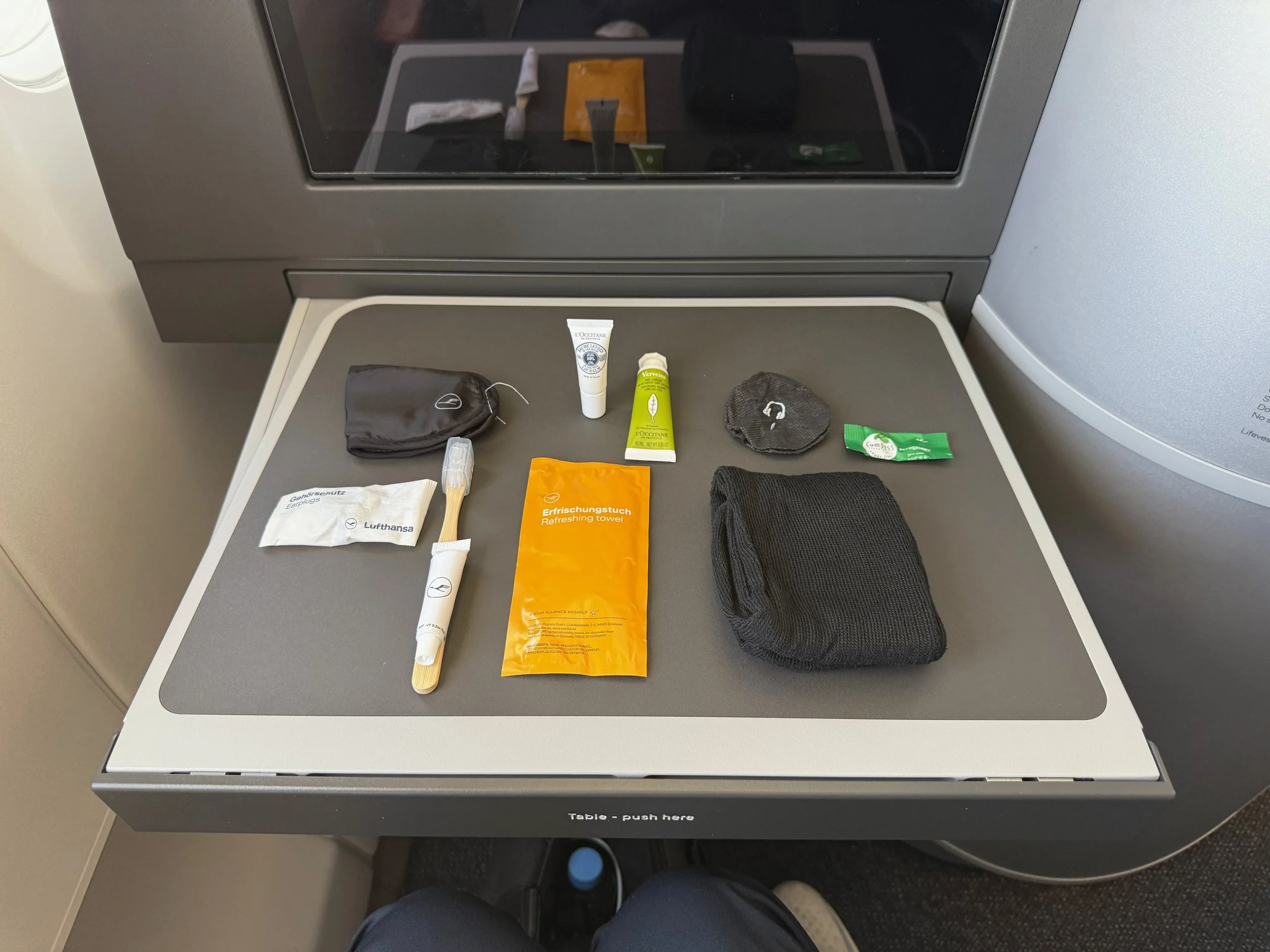 Lufthansa offers a Porsche Design amenity kit for Allegris passengers. Even though it looks like one of those heat blankets inside, the contents are not bad.