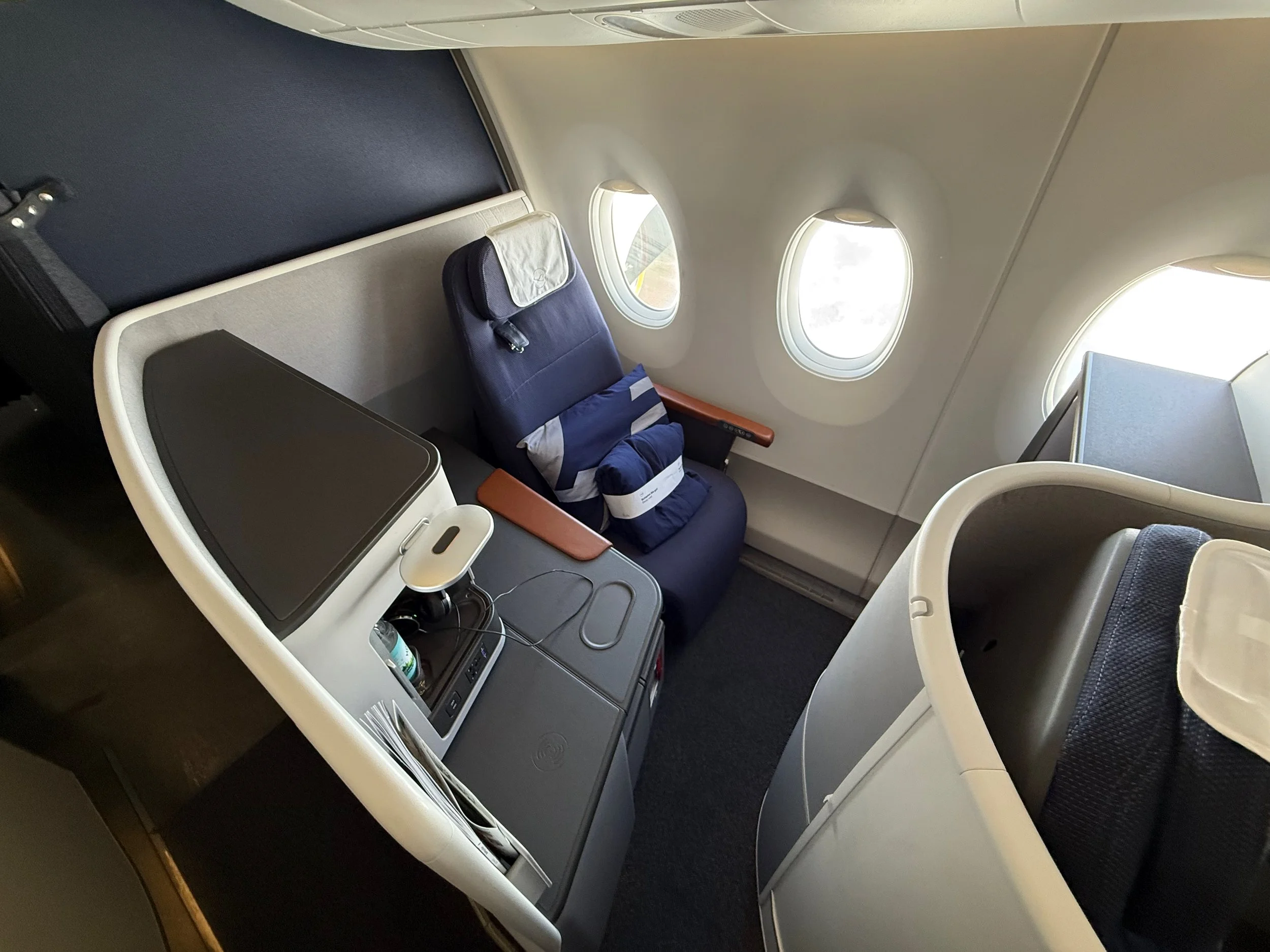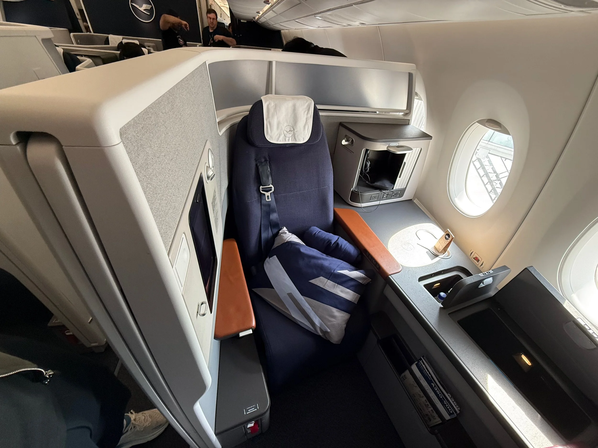 I felt so lucky to be able to move back at 7A because it was vacant. This seat made me realize that the last seat, although lovely in the grand scheme of things, it's not really a very spacious or luxurious feeling seat. Here I suddenly feel like I have a lot more space. The amount of storage, the amount of privacy, everything is just like a completely different product from the seat right in front of me. I was mentally preparing to have to sit in 6C, but afterwards I felt much better to be able to sit in the privacy seat. Unfortunately, most people won't have that luxury since Lufthansa hopes that their flights will be full.