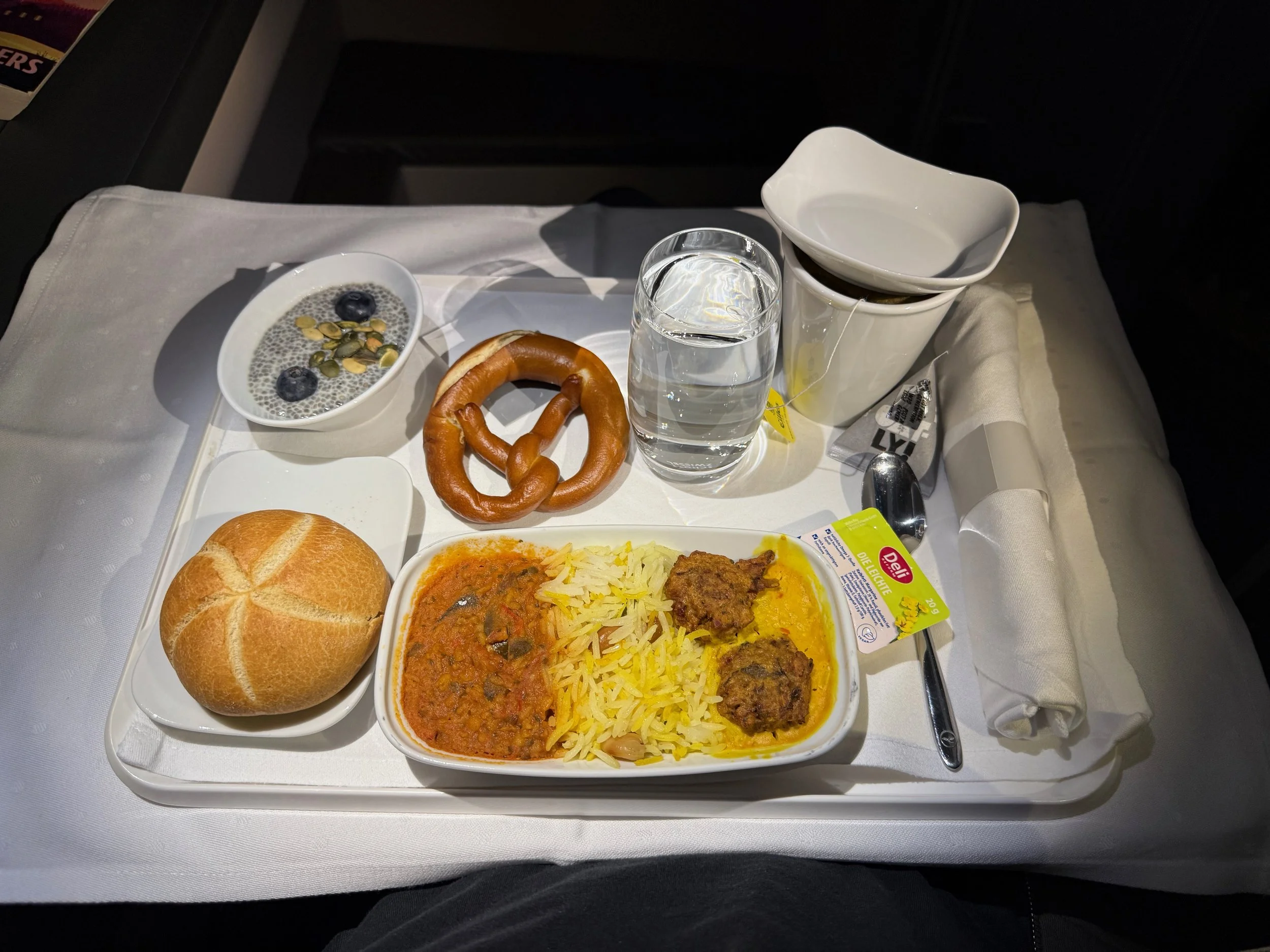 Before delivering my main course, there's all types of weird things from the crew at this point that I feel are unnecessary to bring up because I sound whiny enough. But long story short, whether it's clearing away a lot of stuff before I finished it or not giving me a spoon with my dessert, there is a clear lack of training when it comes to Lufthansa's which is surprising because this crew seems like they've been working there for a long time.